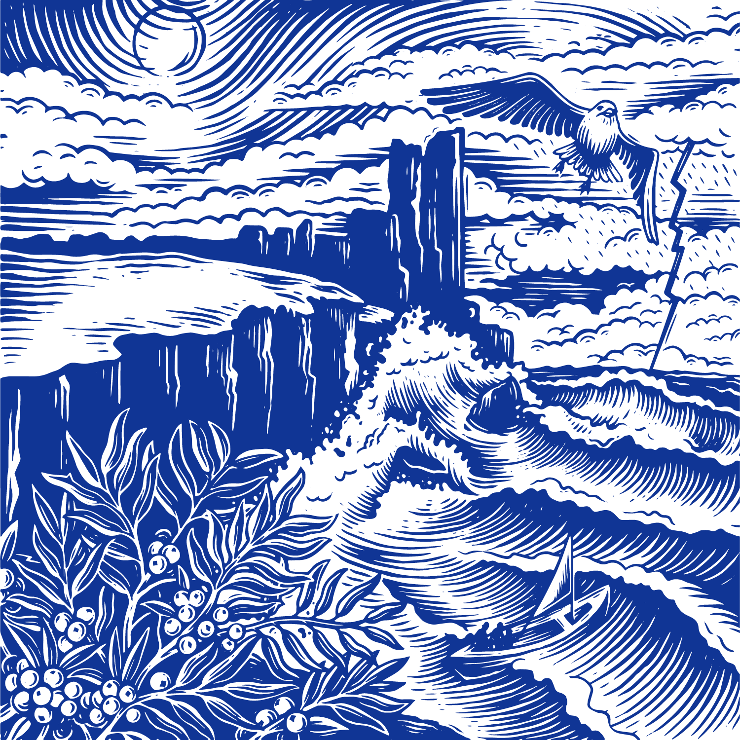 This illustration depicts the tempestuous landscape in which these berries thrive, with churning waves, salt spray and swirling clouds – but with the sun in the distance making its appearance.